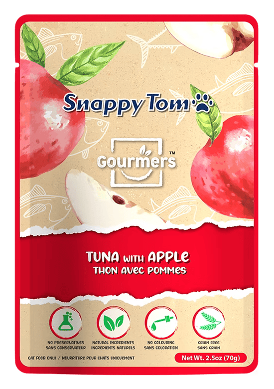 Tuna, Apple, Cassia Gum, Carrageenan, Guar Gum, Choline Chloride, Taurine, Vitamin E Supplements, Calcium Pantothenate, Thiamine Mononitrate (Vitamin B1), Zinc Oxide, Ferrous Sulfate, Manganese Sulfate, Vitamin A Supplement, Niacin Supplement (Vitamin B3), Biotin, Pyridoxine Hydrochloride (Vitamin B6), Riboflavin Supplement (Vitamin B2), Vitamin K3 Supplement, Folic Acid, Vitamin D3 Supplement, Sodium Selenite, Potassium Iodide